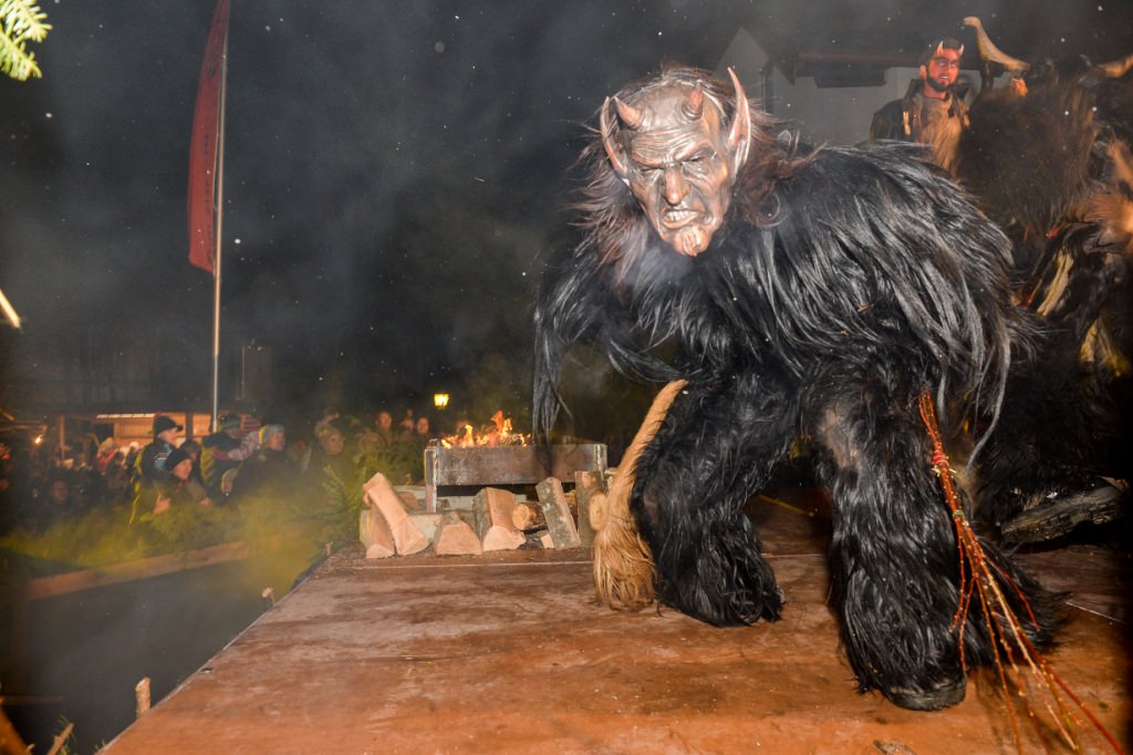 trugen die Anifer Krampusse geschnitzte Holzlarven und einen Vollpelz.
